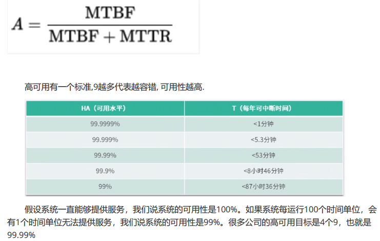 - A表示可用性; MTBF表示平均故障间隔; MTTR表示平均恢复时间