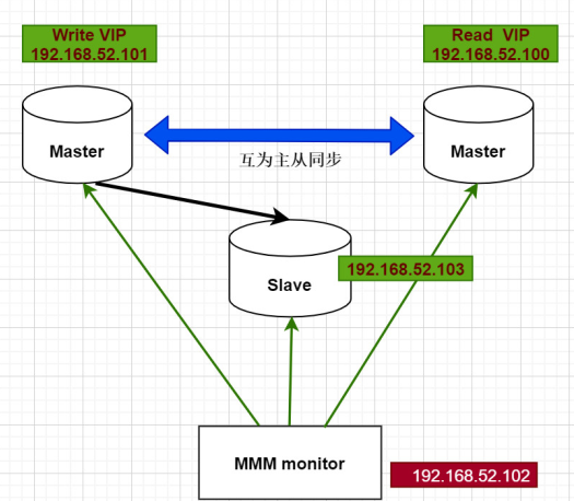 - MMM 包含writer和reader两类角色,分别对应写节点和读节点。当 writer节点出现故障,程序会自动移除该节点上的VIP写操作切换到 Master2,并将Master2设置为writer,将所有Slave节点会指向Master2