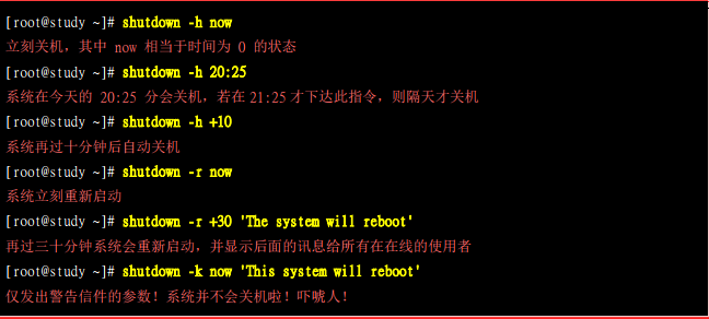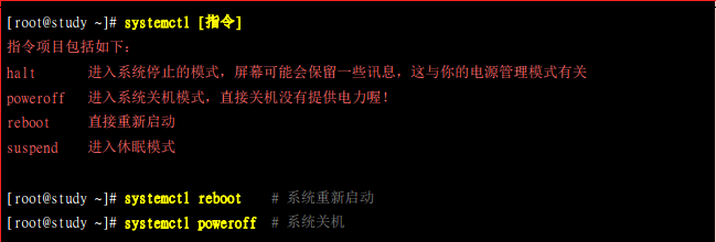 - halt 系统停止,屏幕可能会保留系统已经停止的讯息