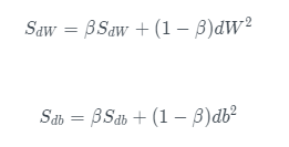 - RMSProp 有助于减少抵达最小值路径上的摆动,并允许使用一个更大的学习率 α,从而加快算法学习速度。并且,它和 Adam 优化算法已被证明适用于不同的深度学习网络结构。β是超参数