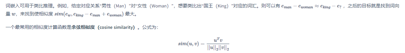 one-hot 向量将每个单词表示为完全独立的个体,不同词向量都是正交的,因此单词间的相似度无法体现。换用特征化表示方法能够解决这一问题。我们可以通过用语义特征作为维度来表示一个词,因此语义相近的词,其词向量也相近。将高维的词嵌入“嵌入”到一个二维空间里,就可以进行可视化。常用的一种可视化算法是 t-SNE 算法,会将man和woman这些词聚集在一块,king和queen聚集在一块等等。在通过复杂而非线性的方法映射到二维空间后,每个词会根据语义和相关程度聚在一起。