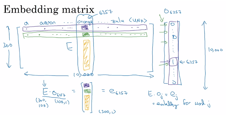 不同的词嵌入方法能够用不同的方式学习到一个嵌入矩阵(Embedding Matrix)E。将字典中位置为oi表示,则有:E*oi=ei。但在实际情况下一般不这么做。因为 one-hot 向量维度很高,且几乎所有元素都是 0,这样做的效率太低。因此,实践中直接用专门的函数查找矩阵E的特定列。