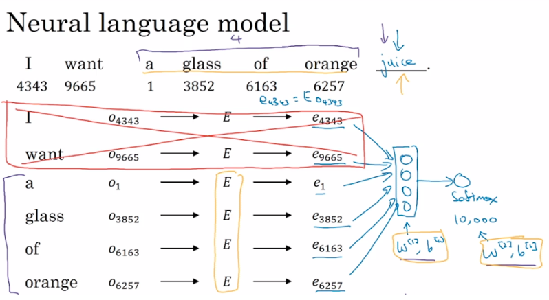 - 学习词嵌入则是有一个固定的词汇表,比如10000个单词,学习向量e1到e10000,学习一个固定的编码,即每一个词汇表的单词的固定嵌入