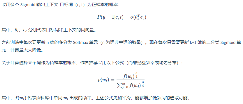 如上图所示,当输入的词为一对上下文-目标词时,标签设置为 1(这里的上下文也是一个词)。另外任意取 k 对非上下文-目标词作为负样本,标签设置为 0。对于小数据集,k=5到20,数据集越小,K越大; 大数据k=2到5