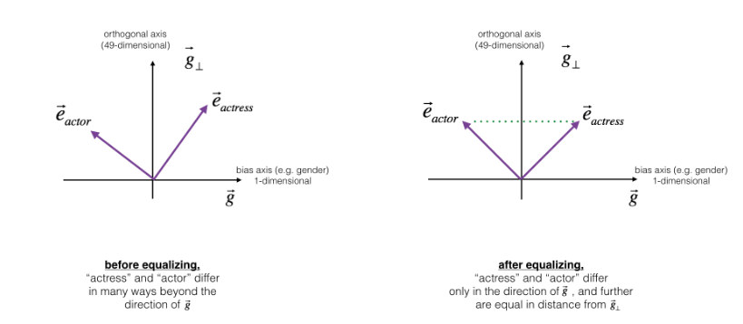 - 均衡本身与性别有关词汇:确保一对词(actor 和 actress)到 g⊥的距离相等。