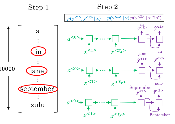 集束搜索(Beam Search)会考虑每个时间步多个可能的选择。设定一个集束宽(Beam Width)B,代表了解码器中每个时间步的预选单词数量。例如 B=3,则将第一个时间步最可能的三个预选单词及其概率值 P(y^⟨1⟩|x)保存到计算机内存,以待后续使用。第二步中,分别将三个预选词作为第二个时间步的输入,选取此结果下的有着最大概率的三个组合。以此类推每次都取概率最大的三种预测。 当 B=1时,集束搜索就变为贪心搜索。