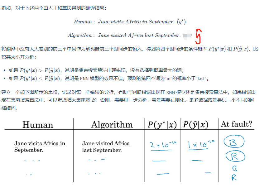 当结合 Seq2Seq 模型和集束搜索算法所构建的系统出错(没有输出最佳翻译结果)时,我们通过误差分析来分析错误出现在 RNN 模型还是集束搜索算
