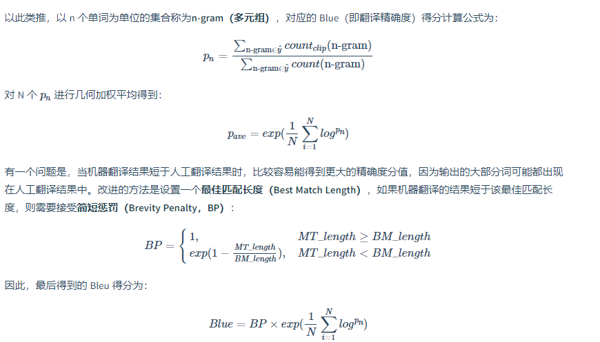 Bleu(Bilingual Evaluation Understudy)得分用于评估机器翻译的质量,其思想是机器翻译的结果越接近于人工翻译,则评分越高,提出了一个表现不错的单一实数评估指标,加快了整个机器翻译领域以及其他文本生成领域的进程。