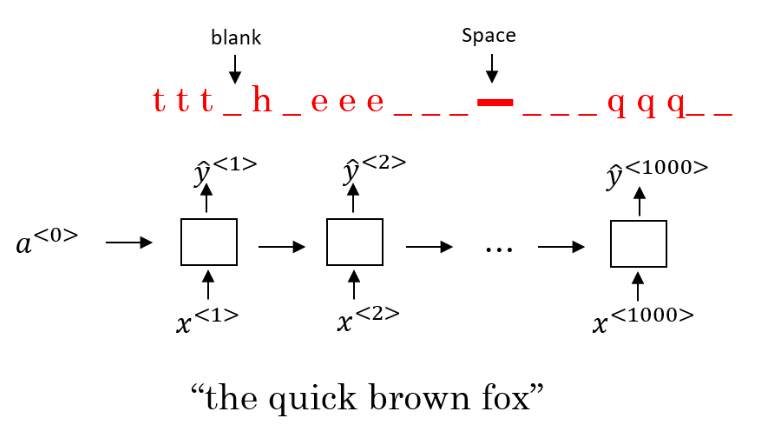 用 CTC(Connectionist Temporal Classification)损失函数来做语音识别的效果也不错。由于输入是音频数据,使用 RNN 所建立的系统含有很多个时间步,且输出数量往往小于输入。因此,不是每一个时间步都有对应的输出。CTC 允许 RNN 生成下图红字所示的输出,并将两个空白符(blank)中重复的字符折叠起来,再将空白符去掉,得到最终的输出文本。