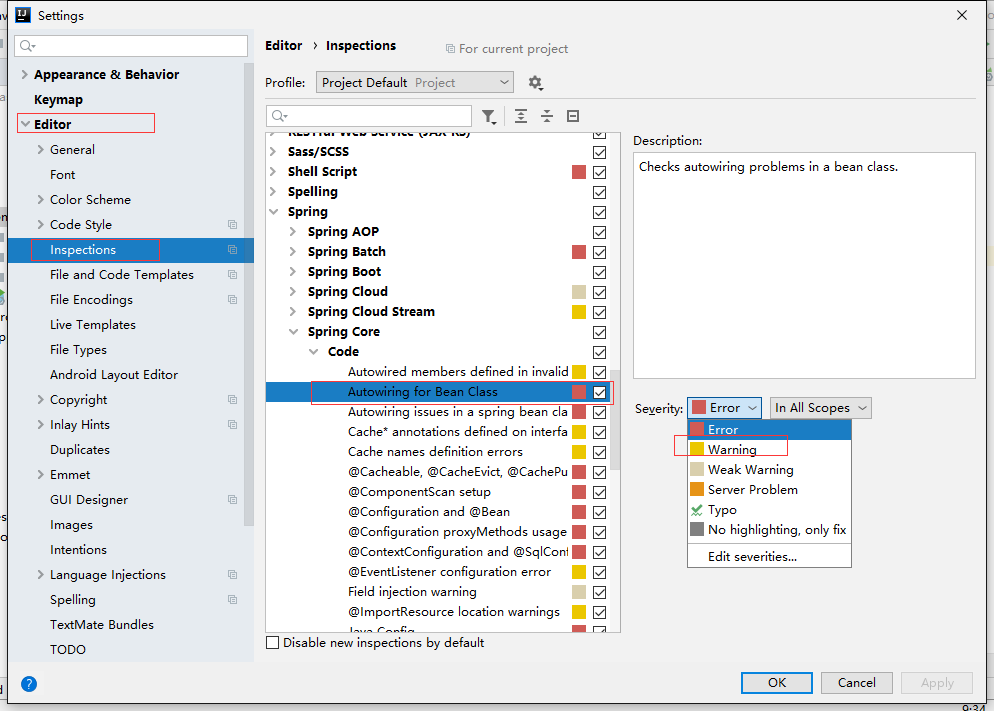 File -->Settings-->Editor-->inspections-->Spring-->Spring Core-->Autowing for Bean Class,把勾选取消或者将右侧的Severity的Error改为Warning即可解决。