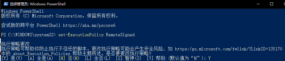 2、在powershell命令窗口中输入set-ExecutionPolicy RemoteSigned