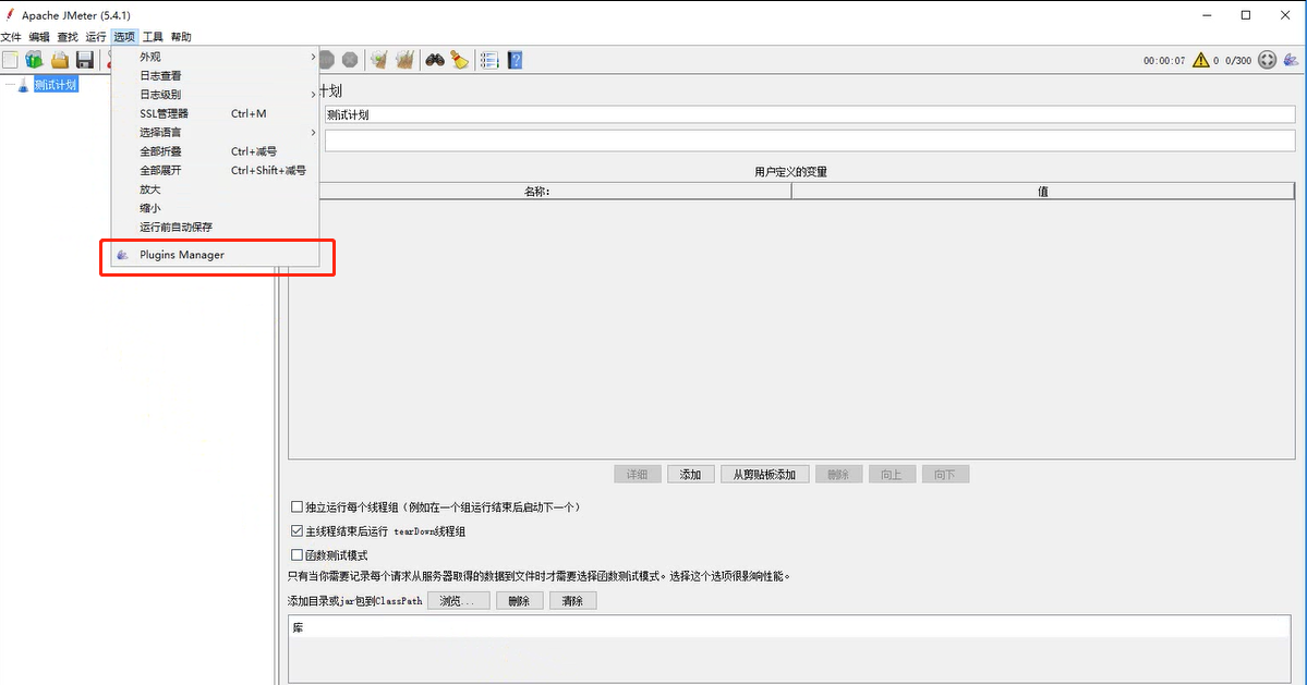 2.重新启动jmeter,在选项中就能看到Plugins Manager (has upgrades)插件管理这个选项。