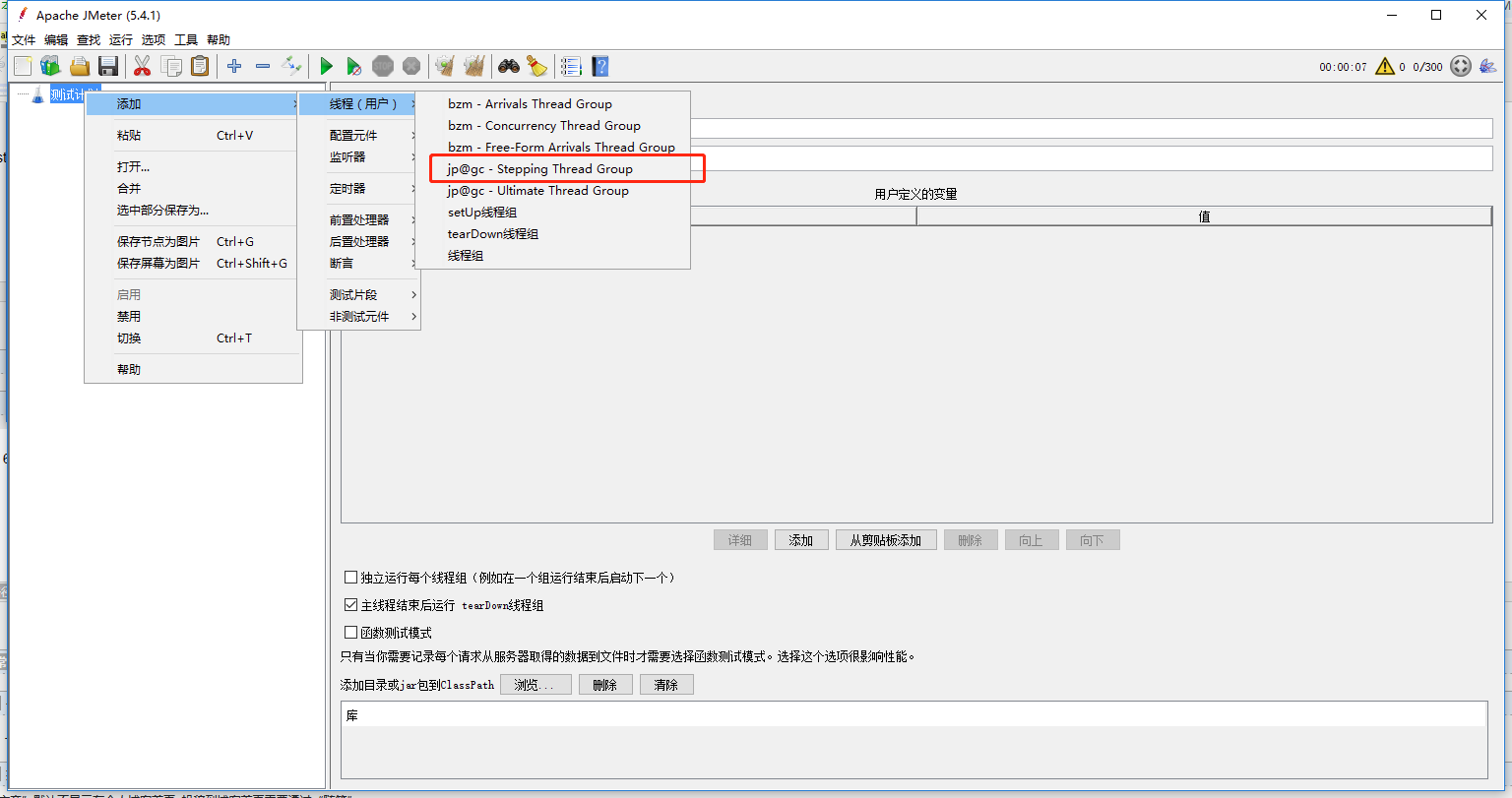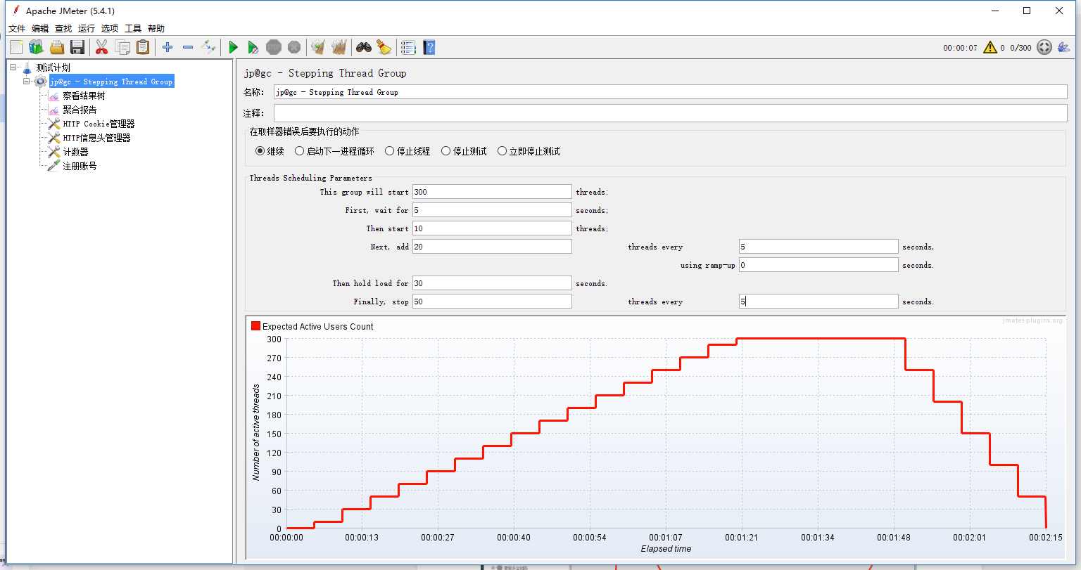- 场景:从10并发开始,每5s加压20并发,直至达到目的并发数300并维持30min,之后保持每5s停止50并发的速率关闭