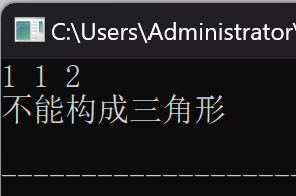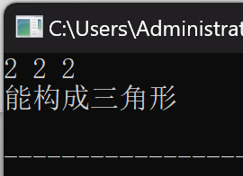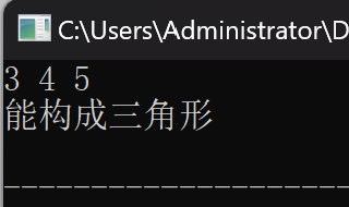 1 // 从键盘上输入三个数据作为三角形边长,判断其能否构成三角形 2 // 构成三角形的条件: 任意两边之和大于第三边 3 4 #include <stdio.h> 5 6 int main() 7 { 8 float a, b, c; 9 // 输入三边边长 10 scanf("%f%f%f", &a, &b, &c); 11 12 // 判断能否构成三角形 13 // 补足括号里的逻辑表达式 14 if(a+b>c&&a+c>b&&b+c>a) 15 printf("能构成三角形\n"); 16 else 17 printf("不能构成三角形\n"); 18 19 return 0; 20 }