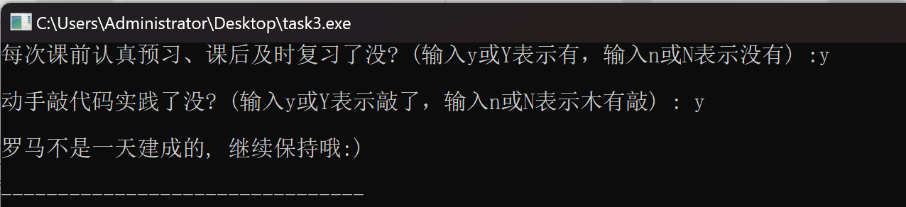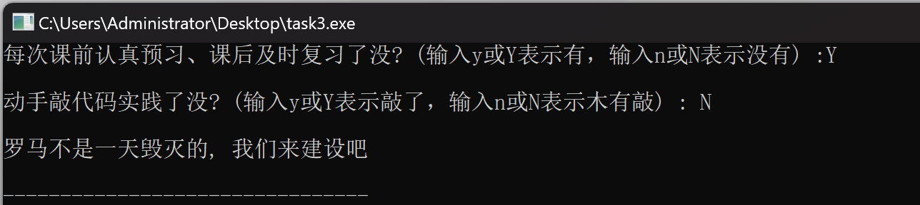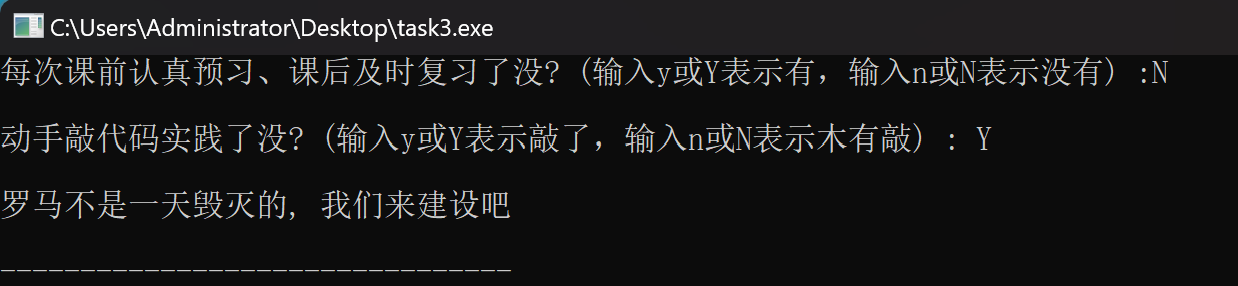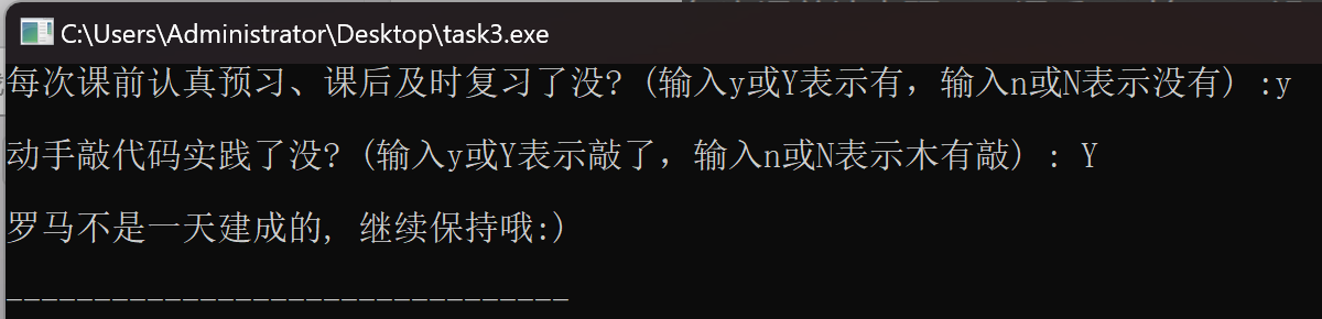 1 #include <stdio.h> 2 int main() 3 { 4 char ans1, ans2; // 用于保存用户输入的答案 5 printf("每次课前认真预习、课后及时复习了没? (输入y或Y表示有,输入n或N表示没有) :"); 6 ans1 = getchar(); // 从键盘输入一个字符,赋值给ans1 7 getchar(); // 思考这里为什么要加这一行。试着去掉这一行,看看对运行有没有影响。 8 printf("\n动手敲代码实践了没? (输入y或Y表示敲了,输入n或N表示木有敲) : "); 9 ans2 = getchar(); 10 if ((ans1 == 'y'||ans1 == 'Y')&&(ans2 == 'Y'||ans2 == 'y')) // 待补足,判断用户回答ans1和ans2都是小写y或大写Y 11 printf("\n罗马不是一天建成的, 继续保持哦:)\n"); 12 else 13 printf("\n罗马不是一天毁灭的, 我们来建设吧\n"); 14 return 0; 15 }