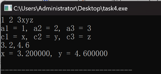 1 #include<stdio.h> 2 int main() 3 { 4 double x, y; 5 char c1, c2, c3; 6 int a1, a2, a3; 7 scanf("%d%d%d", &a1, &a2, &a3);//scanf(" ",&__) 8 printf("a1 = %d, a2 = %d, a3 = %d\n", a1,a2,a3); 9 scanf("%c%c%c", &c1, &c2, &c3); 10 printf("c1 = %c, c2 = %c, c3 = %c\n", c1, c2, c3); 11 scanf("%lf,%lf", &x, &y);//scanf输入double用lf 12 printf("x = %f, y = %lf\n",x, y); 13 return 0; 14 }
