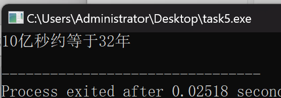 1 // 计算10亿秒约等于多少年,并打印输出 2 #include <stdio.h> 3 int main() 4 { 5 int year; 6 // 补足代码 7 // ××× 8 year = (int)(10e+8/3600/24/365 + 0.5); 9 10 11 printf("10亿秒约等于%d年\n", year); 12 return 0; 13 }