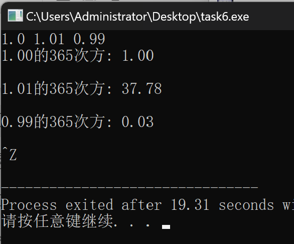 1 #include <stdio.h> 2 #include <math.h> 3 int main() 4 { 5 double x, ans; 6 while(scanf("%lf", &x) != EOF){ 7 ans = pow(x, 365); 8 printf("%.2f的365次方: %.2f\n", x, ans); 9 printf("\n"); 10 } 11 return 0; 12 }