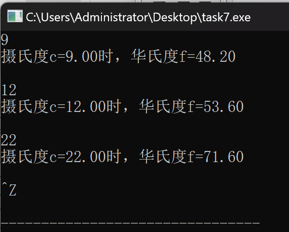 1 //实现摄氏度温度C与华氏度温度F的转换 2 #include <stdio.h> 3 int main (){ 4 double C,F; 5 while(scanf("%lf",&C) != EOF){ 6 F = C*9/5 + 32; 7 printf("摄氏度c=%.2lf时,华氏度f=%.2lf ",C,F); 8 } 9 return 0; 10 }