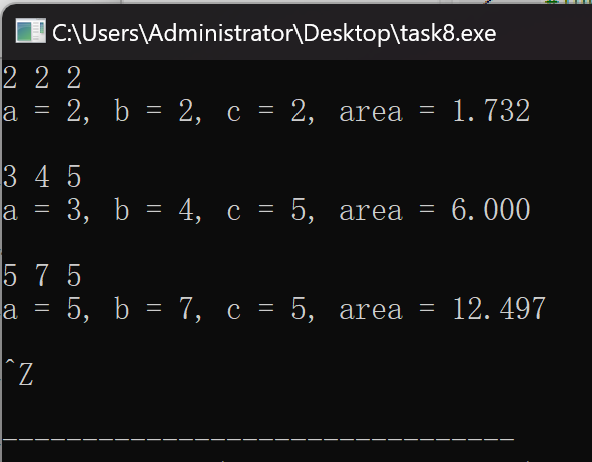 1 //用海伦公式计算三角形面积 2 #include<stdio.h> 3 #include<math.h> 4 int main (){ 5 int a,b,c; 6 double s,area; 7 8 while(scanf("%d%d%d",&a,&b,&c) != EOF){ 9 s = (a+b+c)/2.0; 10 area = sqrt(s*(s-a)*(s-b)*(s-c)); 11 printf("a = %d, b = %d, c = %d, area = %.3lf",a,b,c,area); 12 } 13 14 return 0; 15 }