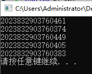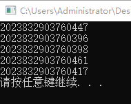 1 #include <stdio.h> 2 #include <stdlib.h> 3 #include <time.h> 4 #define N 5 5 #define N1 374 6 #define N2 465 7 8 int main() 9 { 10 int number; 11 int i; 12 srand( time(0) ); // 以当前系统时间作为随机种子 13 for(i = 0; i < N; ++i) { 14 number = rand()%(N2 - N1 + 1) + N1; 15 printf("202383290376%04d\n", number); 16 } 17 18 system("pause"); 19 return 0; 20 }