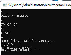 1 #include <stdio.h> 2 #include <stdlib.h> 3 4 int main() 5 { char x; 6 7 while(scanf("%c",&x) != EOF){ 8 if(x == 'y') 9 printf("wait a minute\n"); 10 else if(x == 'g') 11 printf("go go go\n"); 12 else if(x == 'r') 13 printf("stop\n"); 14 else printf("something must be wrong...\n"); 15 getchar(); 16 } 17 18 19 20 21 system("pause"); 22 return 0; 23 }