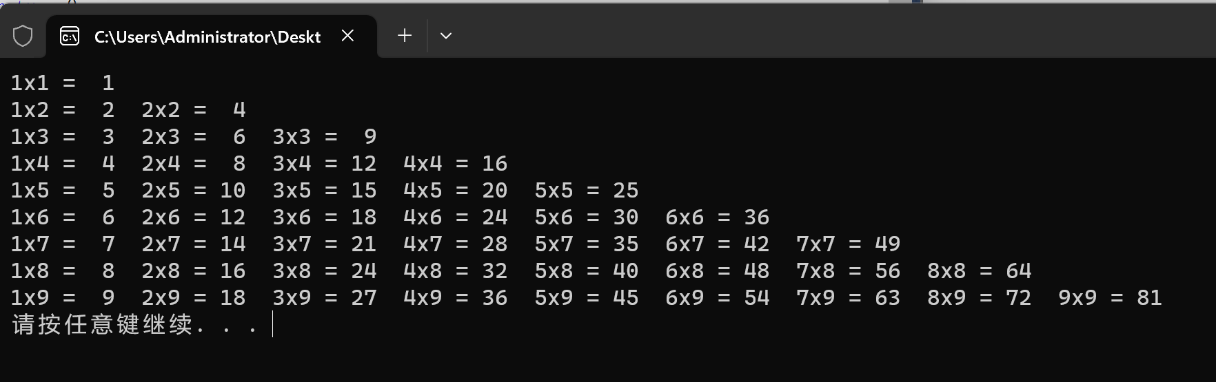 1 #include <stdio.h> 2 #include <stdlib.h> 4 5 int main() 6 { int i,j,ans; 7 for(i = 1; i <= 9; i++){ 8 for(j = 1; j <= i; j++){ 9 ans = i*j; 10 printf("%dx%d = %2d ",j,i,ans); 11 } 12 printf("\n"); 13 } 14 system("pause"); 15 return 0; 16 }
