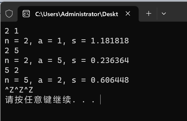 1 #include <stdio.h> 2 #include <stdlib.h> 3 #include <math.h> 4 5 int main() 6 { int n,a,i; 7 double s; 8 9 while(scanf("%d%d",&n,&a) != EOF){ 10 k = s = 0; 11 for(i = 1; i <= n; i++){ 12 k = 10*k +1; 13 s += 1.0*i/a/k; 14 } 15 printf("n = %d, a = %d, s = %lf",n,a,s); 16 } 17 18 system("pause"); 19 return 0; 20 }