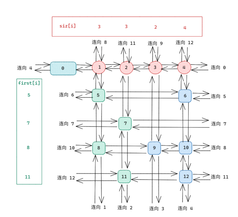 对于链表中的每一行,维护一个头指针 \(first\);对于每一列,维护每一列中的节点个数 \(siz\)。
