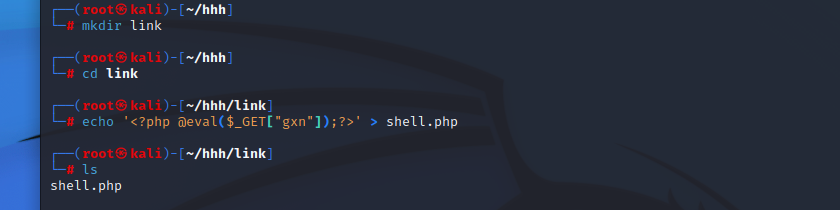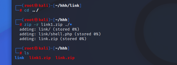 然后删除link(防止与文件夹重名)这个文件,创建一个名为link的文件夹,然后在这个文件夹下写入带马的Php文件(因为之前我们软连接的文件叫做link,所以我们要让这个压缩在这个文件夹下面):