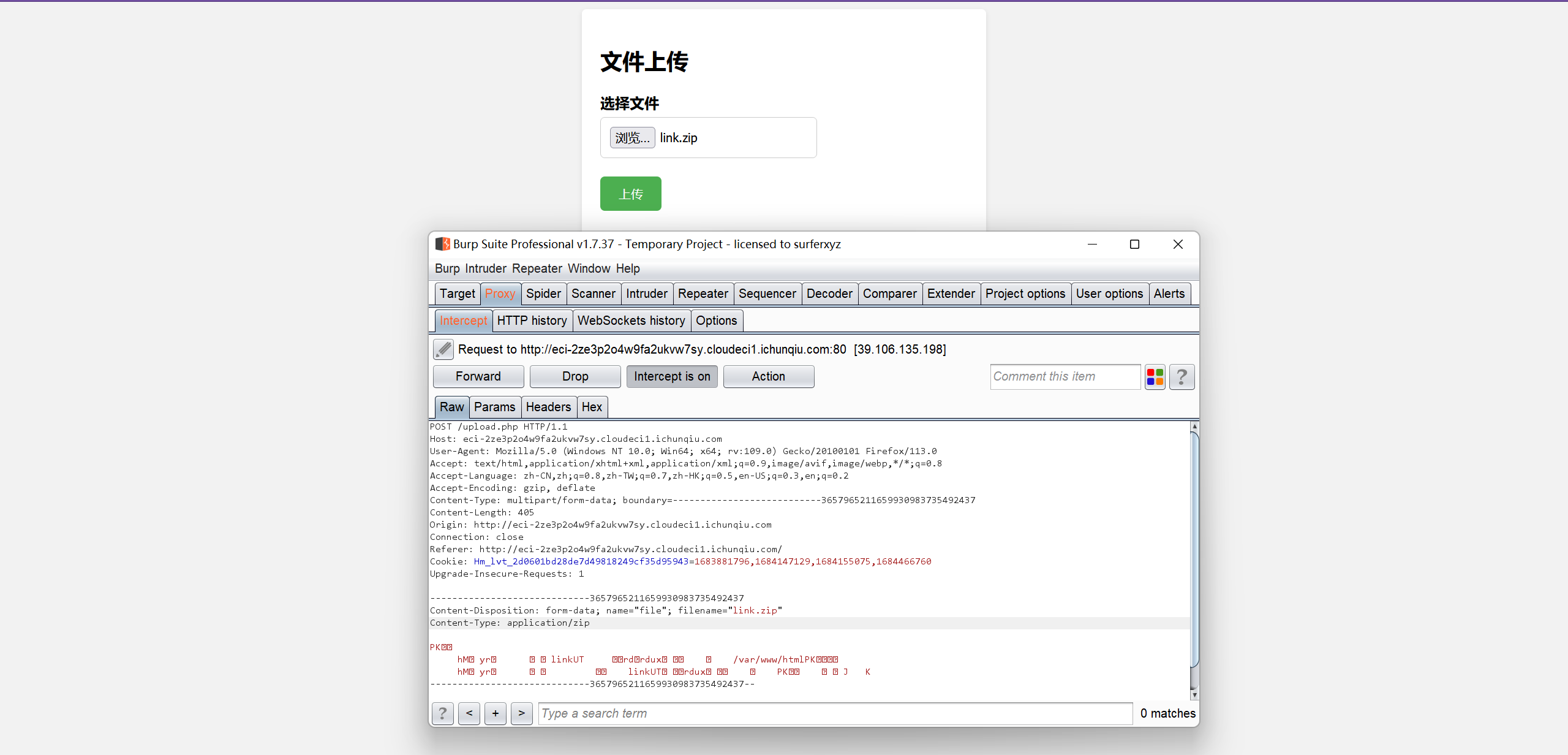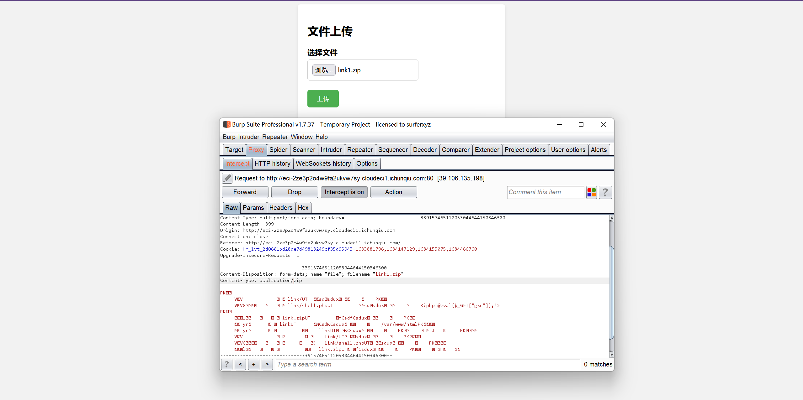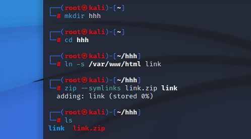 那么方向就很明显了,我们可以先上传一个带有软连接的压缩包,这个软连接指向网站的根目录,即/var/www/html,然后我们再上传一个带有马的文件的压缩包,就可以将这个带马文件压缩到网站的根目录下,我们也可以直接访问这个带马文件了,思路瞬间清晰捏,那么直接开始实践: