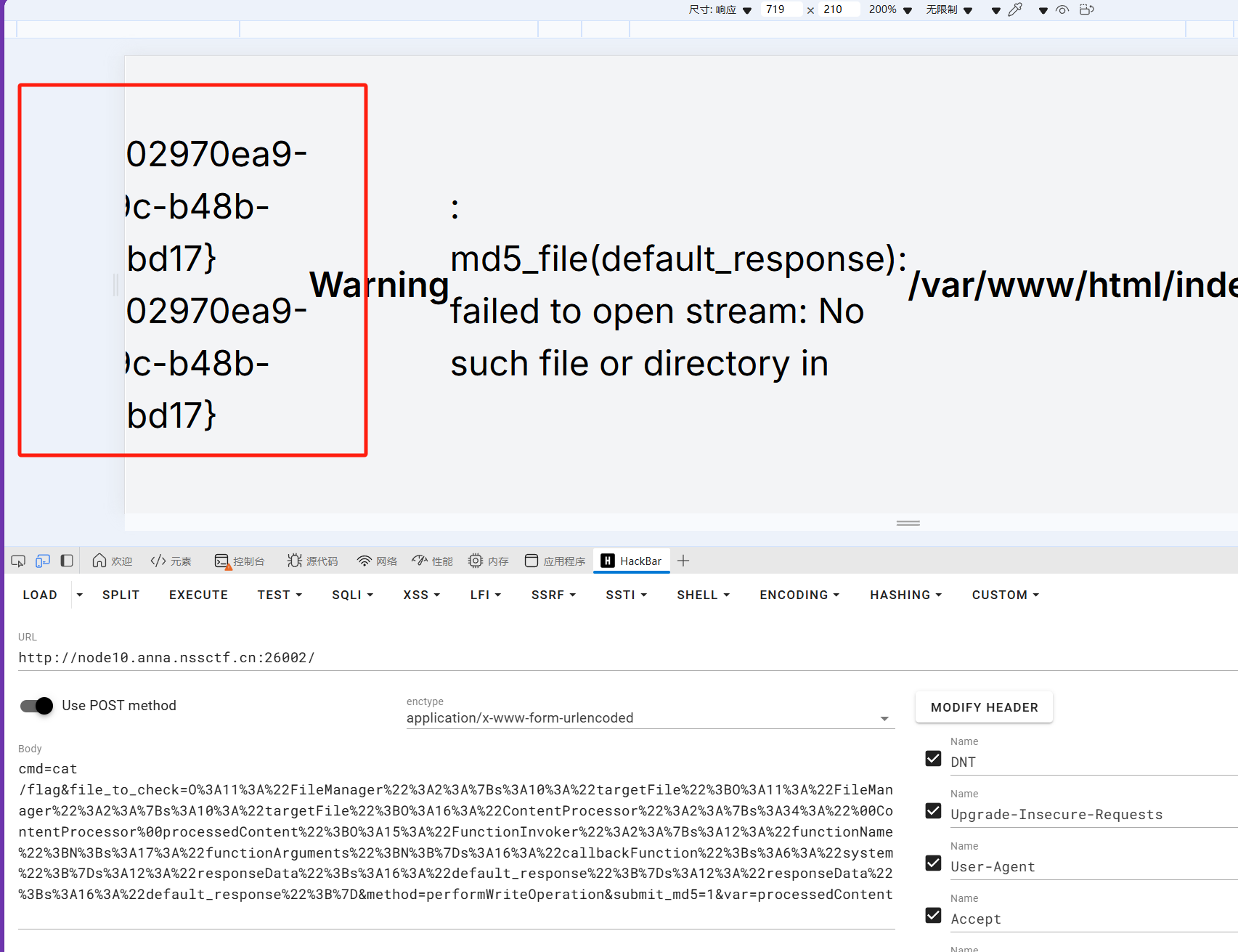 getFileHash()时,由于targetFile是对象,md5_file()会尝试将对象转换为字符串,触发__toString方法。 - 通过 POST 参数