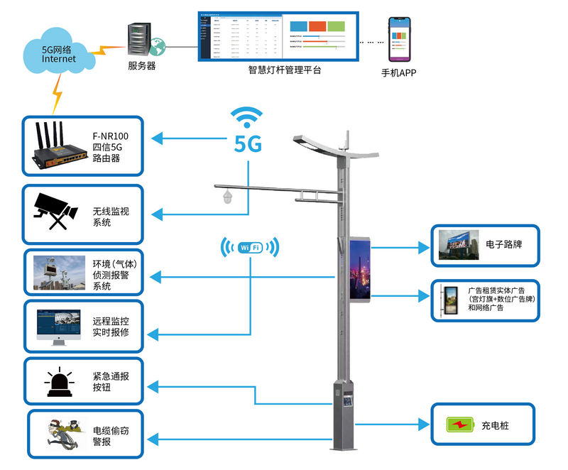 (2)WiFi覆盖:工业级无线路由器F-G200,具有5G转WiFi功能;WiFi覆盖距离长、速率快,协助智慧灯杆实现公共WiFi覆盖。