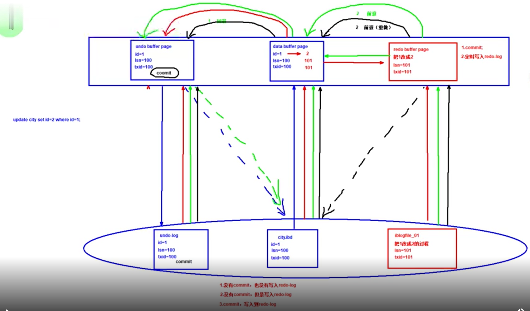 当断电,内存中全丢失之后,重启数据库,会将.ibd数据文件和 iblog_file redo日志文件和ibdata undo日志文件 一起加载到内存,