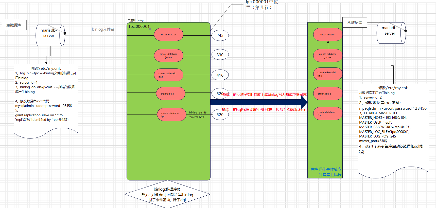 修改/etc/my.cnf: 1、log_bin=fpc ---binlog文件的前缀 , 启用binlog 2、server-id=1 3、binlog_do_db=jxcms ---指定的数据库产生binlog 4、修改数据库root密码: mysqladmin -uroot password 123456 5、 grant replication slave on *.* to 'repl'@'%' identified by 'repl@123';