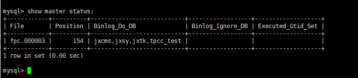 mysql> reset master; Query OK, 0 rows affected (0.00 sec) mysql> show master status; +------------+----------+---------------------------+------------------+-------------------+ | File | Position | Binlog_Do_DB | Binlog_Ignore_DB | Executed_Gtid_Set | +------------+----------+---------------------------+------------------+-------------------+ | fpc.000001 | 154 | jxcms,jxsy,jxtk,tpcc_test | | | +------------+----------+---------------------------+------------------+-------------------+ 1 row in set (0.00 sec) mysql>