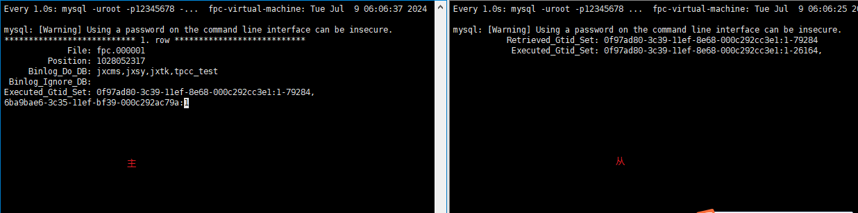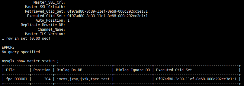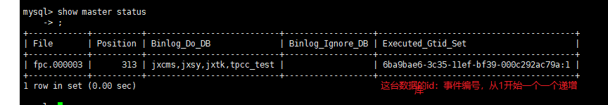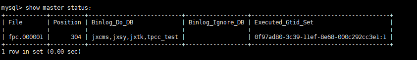 mysql> show master status; +------------+----------+---------------------------+------------------+--------------------------------------------------------------------------------+ | File | Position | Binlog_Do_DB | Binlog_Ignore_DB | Executed_Gtid_Set | +------------+----------+---------------------------+------------------+--------------------------------------------------------------------------------+ | fpc.000001 | 454 | jxcms,jxsy,jxtk,tpcc_test | | 0f97ad80-3c39-11ef-8e68-000c292cc3e1:1, 6ba9bae6-3c35-11ef-bf39-000c292ac79a:1 | +------------+----------+----------------