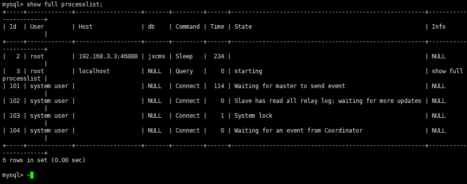 system user有四个线程: wating for master to send envent 是io线程,同步binlog;