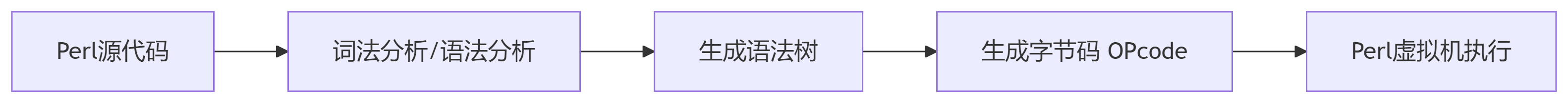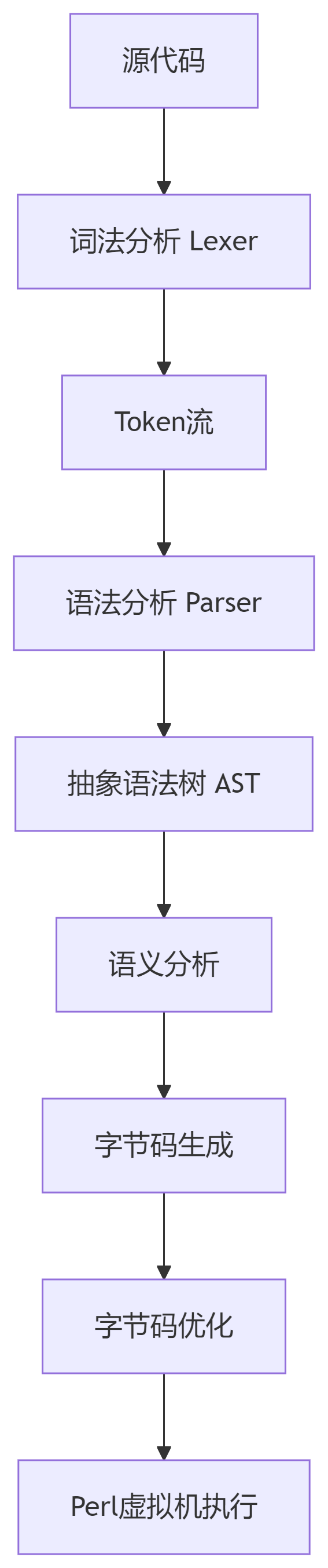 Perl 是 解释型语言,它的编译过程输出的是 Perl 虚拟机字节码(OPcode),不是汇编代码,字节码需通过虚拟机转换为机器码或解释执行
