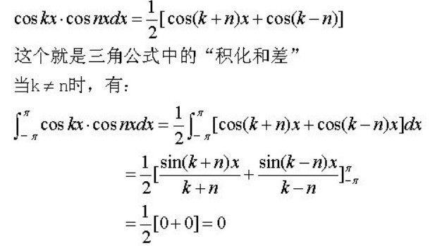 以上各式在区间[-π, π]的定积分均为0,第1第2式可视为三角函数cos和sin与1相乘的积分;第3-5式则为sin和cos的不同组合相乘的积分式。除了这5个式子外,不可能再有其他的组合了。注意,第4第5两个式中,k不能等于n,否则就不属于“三角函数系中任意两个不同函数”的定义了,变成同一函数的平方了。但第3式中,k与n可以相等,相等时也是二个不同函数。下面通过计算第4式的定积分来验证其正确性,第4式中二函数相乘可以写成: