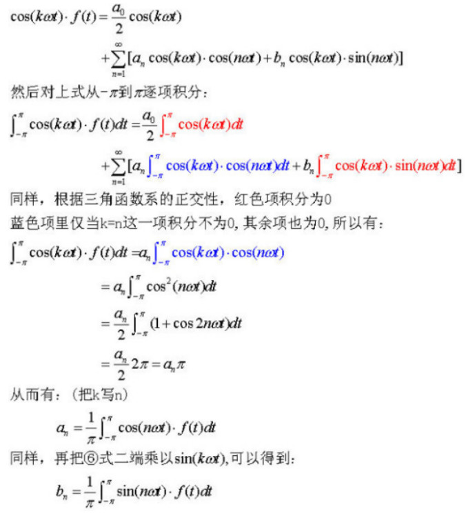 这就求得了第一个系数a0的表达式,即最上边傅里叶级数公式里的②式。接下来再求an和bn的表达式。用cos(kωt)乘⑥式的二边得: