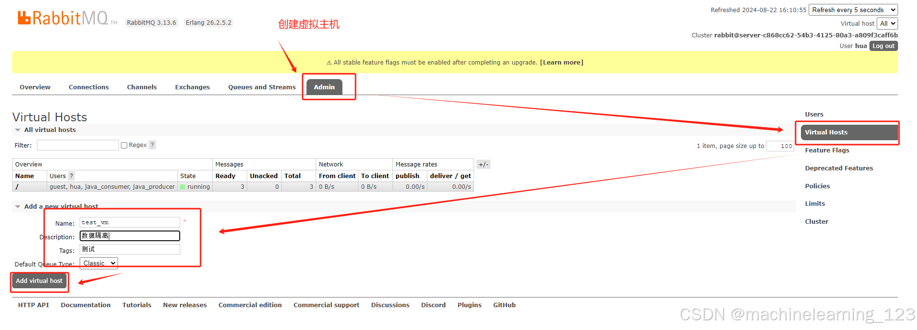 资源隔离:不同虚拟主机之间的资源(如队列和交换机)完全隔离,防止不同应用间的资源冲突。