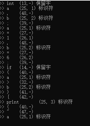 printf(">> %s\t(25,%d) 标识符\n", word, q);