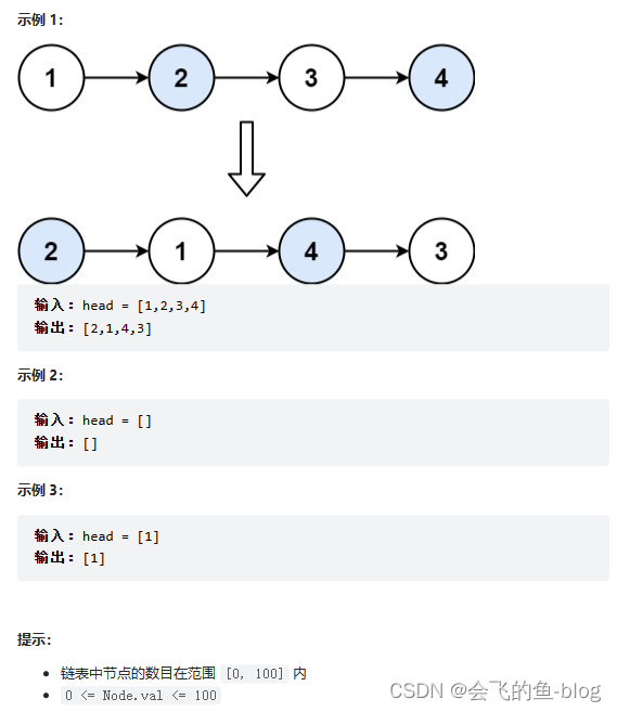 给你一个链表,两两交换其中相邻的节点,并返回交换后链表的头节点。你必须在不修改节点内部的值的情况下完成本题(即,只能进行节点交换)。