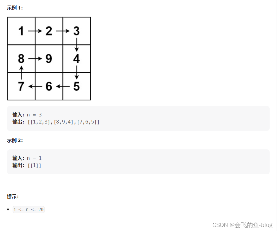 给你一个正整数 n ,生成一个包含 1 到 n2 所有元素,且元素按顺时针顺序螺旋排列的 n x n 正方形矩阵 matrix 。