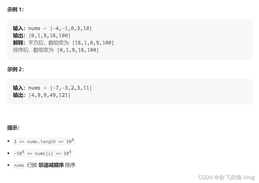 给你一个按 非递减顺序 排序的整数数组 nums,返回 每个数字的平方 组成的新数组,要求也按 非递减顺序 排序。