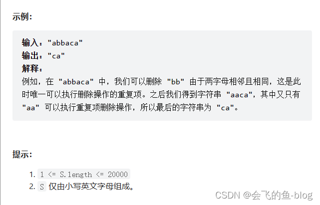 给出由小写字母组成的字符串 S,重复项删除操作会选择两个相邻且相同的字母,并删除它们。