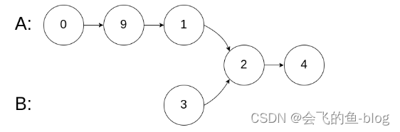 从各自的表头开始算起,链表 A 为 [0,9,1,2,4],链表 B 为 [3,2,4]。