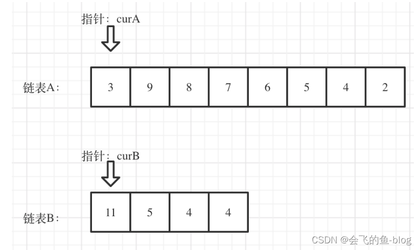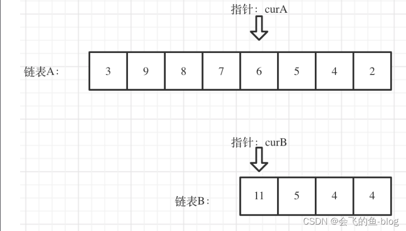 看如下两个链表,目前curA指向链表A的头结点,curB指向链表B的头结点: