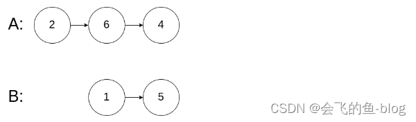 解释:从各自的表头开始算起,链表 A 为 [2,6,4],链表 B 为 [1,5]。